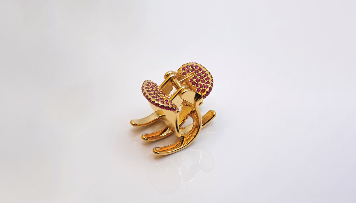 SHE WAS INSPIRED TO INCORPORATE RUBIES AS FOUND IN HER PERSONAL FAMILIAL HEIRLOOMS, MAKING NEW HEIRLOOMS THAT ALLUDE TO HER OBSESSIONS WITH LUXURY AND HAIR ADORNMENT. HER PROCESSES INCLUDE EPISTOLARY CREATIVE WRITING, COLLABORATION, TRADITIONAL AND CONTEMPORARY WAYS OF DESIGNING, BETWEEN THE ANALOGUE AND TECHNOLOGY, TRADITIONAL JEWELLERY TECHNIQUES AND CONTEMPORARY ONES THAT REQUIRE THE USE OF TECHNOLOGIES LIKE CAD AND CAM.